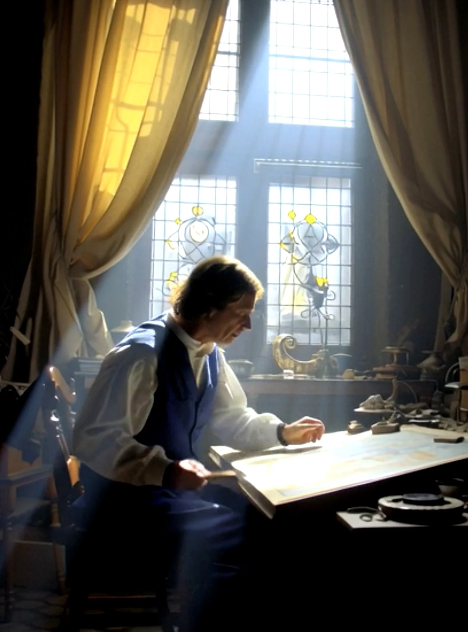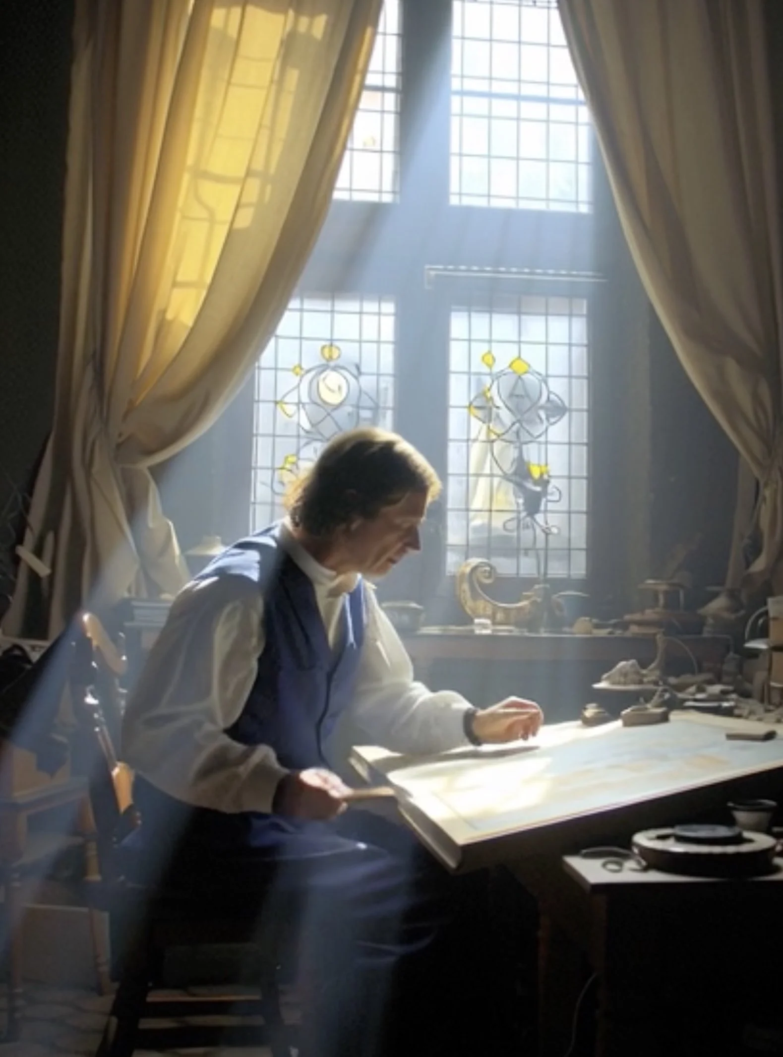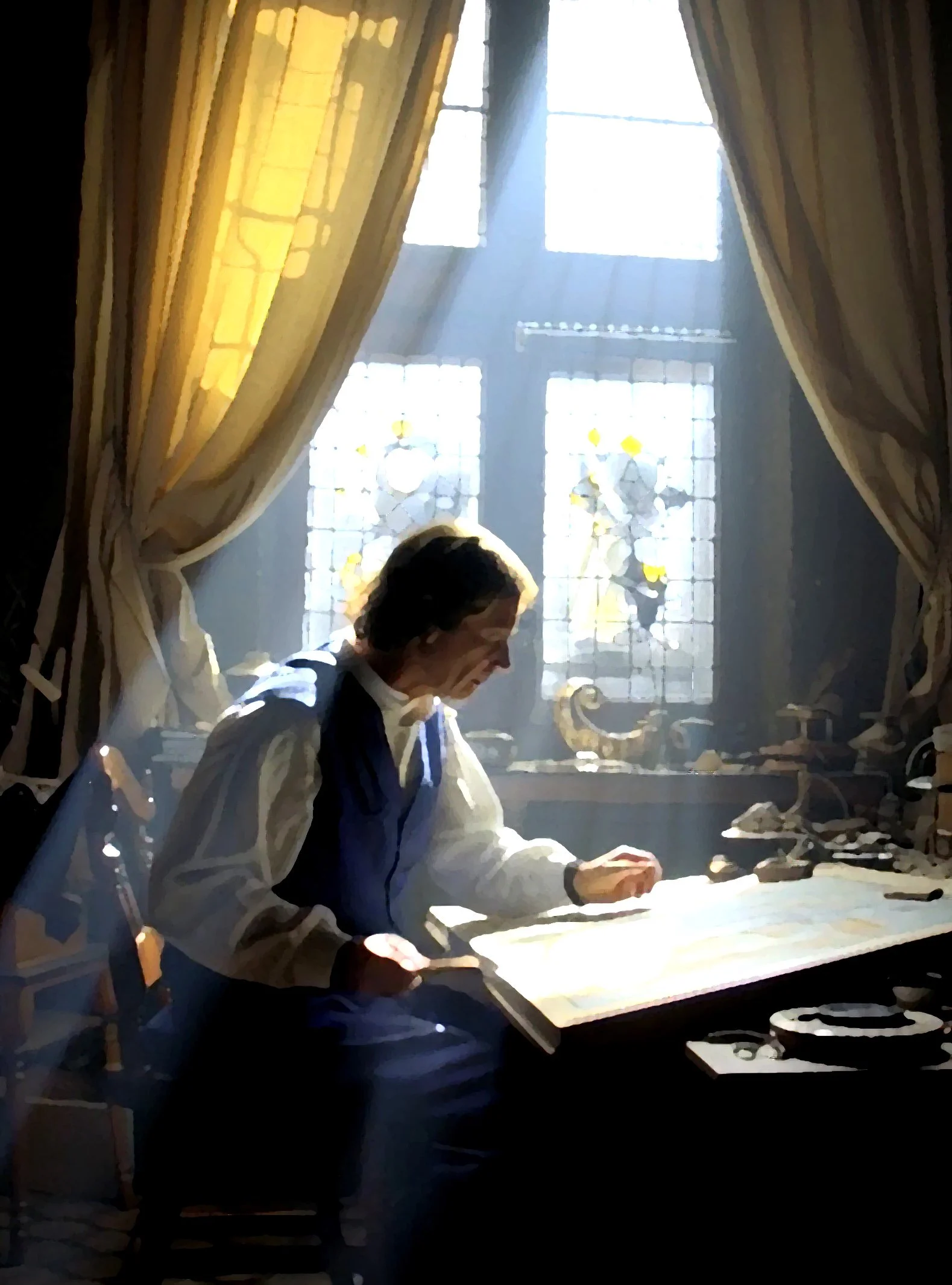 Imagine Vermeer in his quiet studio — light streaming through a window, illuminating the scene he so carefully staged.